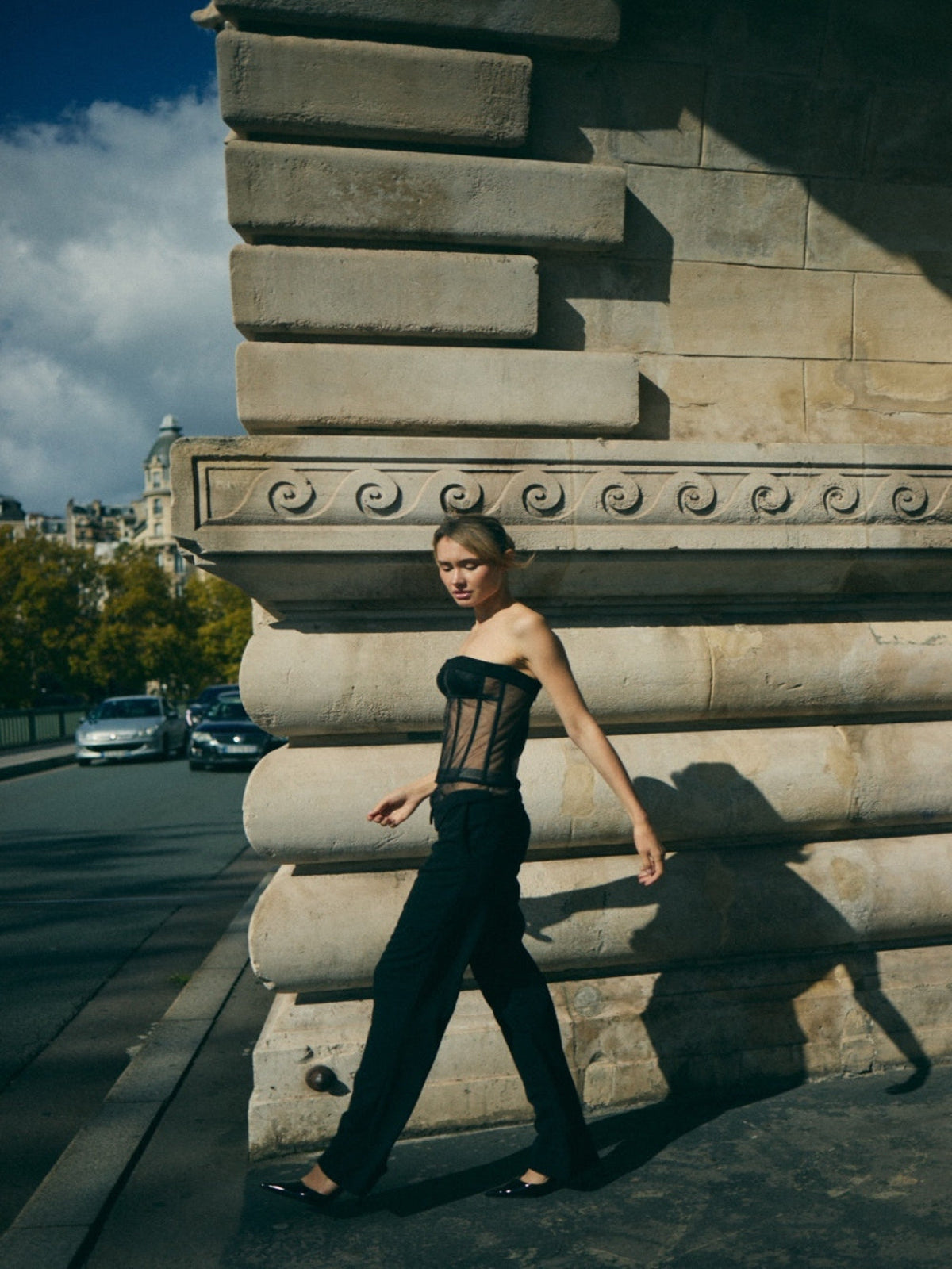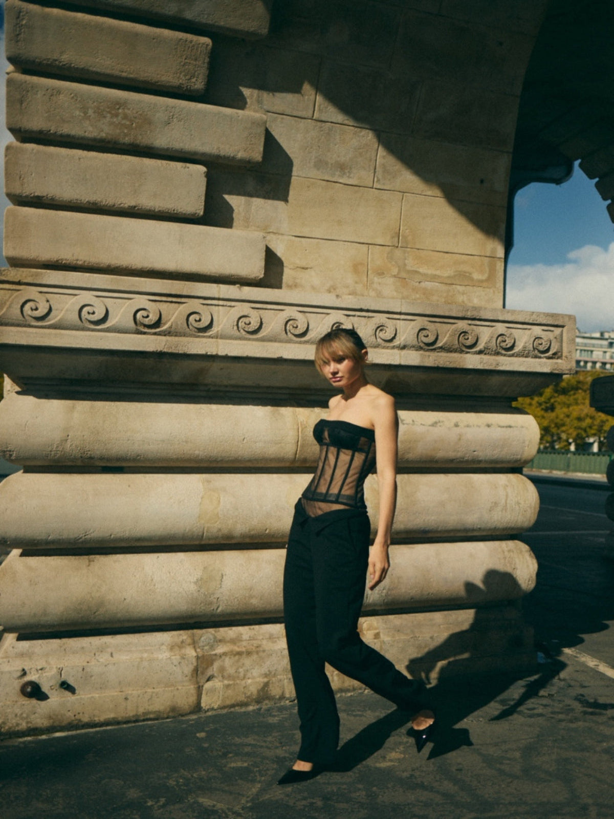 Transparencia y estructura en equilibrio perfecto. El Superposée Pant une la solidez del crêpe con la ligereza del mesh interior, generando un efecto de capas que revela sin mostrar. La doble pretina estructura la cintura con precisión, mientras la silueta recta mantiene un porte sereno y sofisticado.