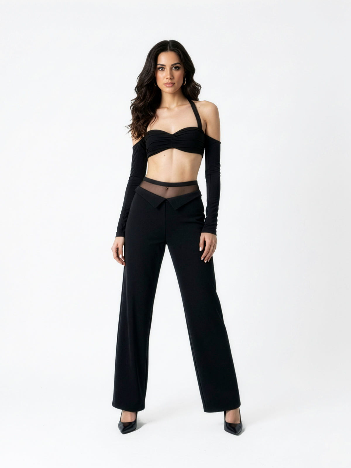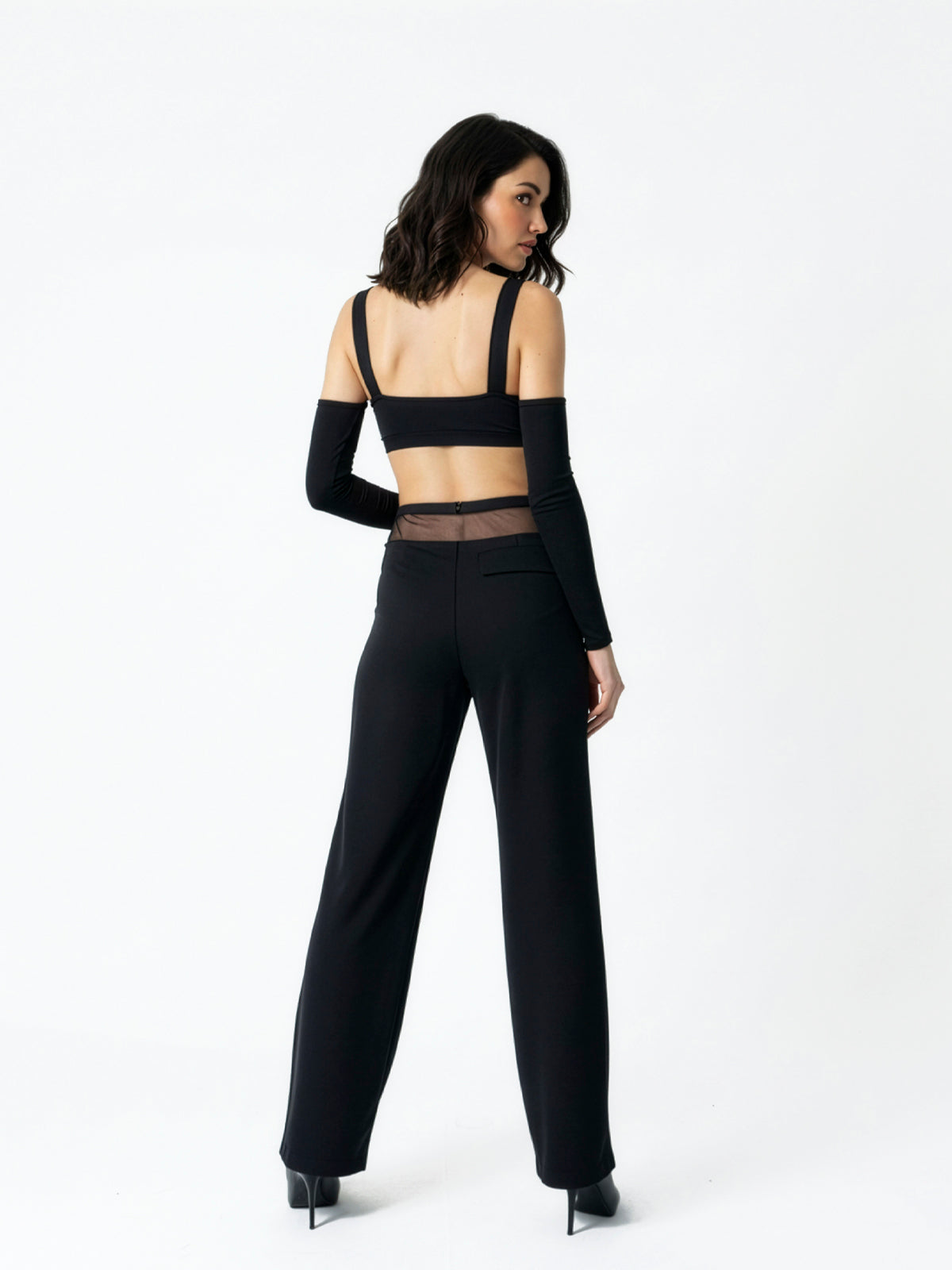 Descripción técnica: Pantalón recto en crêpe negro con interior en mesh translúcido. Pretina doble estructurada, bolsillo de solapa lateral y cierre posterior invisible de 16 cm.
