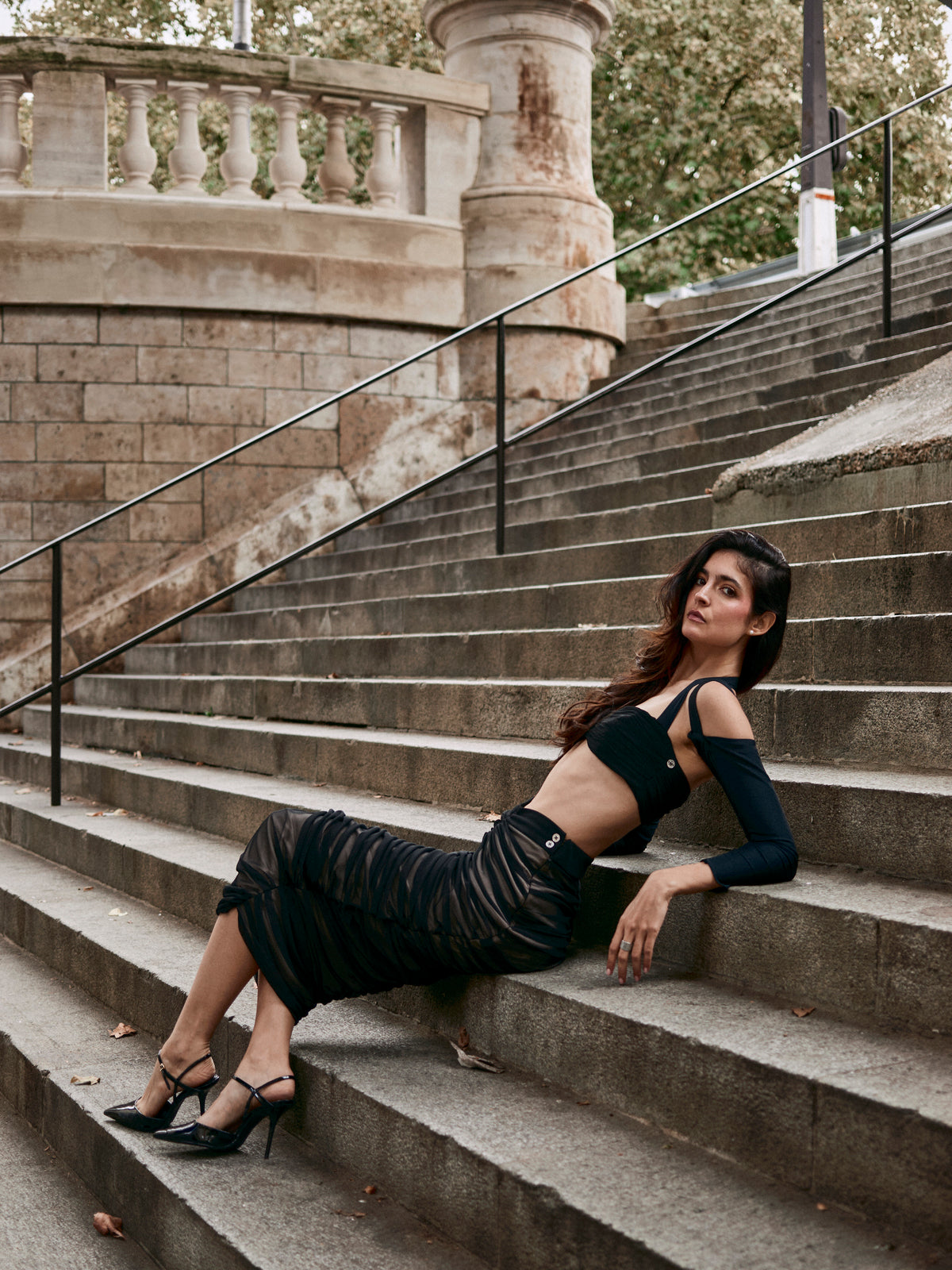 Descripción técnica: Falda larga en mesh negro sobre crepé elástico, forrada en lycra nude. Drapeado frontal y posterior, tiro medio, cierre invisible de 18 cm y botones metálicos Zcapitta en pretina lateral.