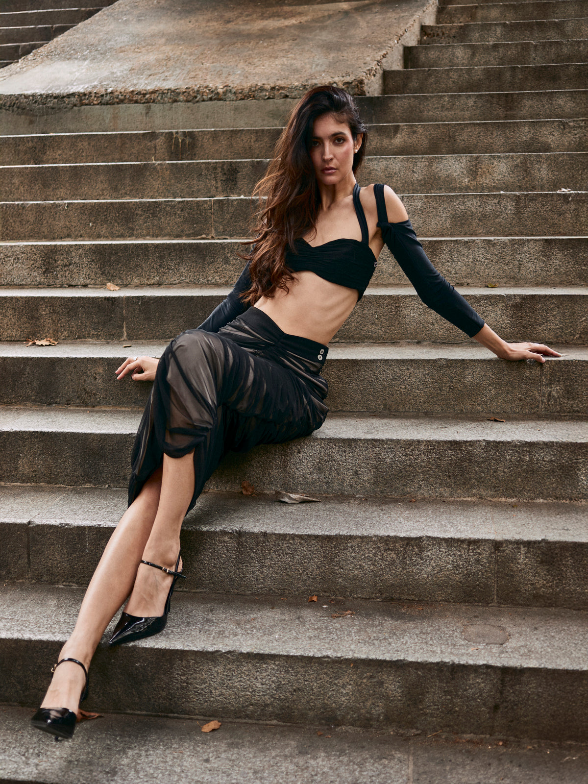 Capas de mesh negro se cruzan sobre una base de crepé elástico, envolviendo el cuerpo con un drapeado que revela y contiene a la vez. El forro en lycra nude aporta contraste y profundidad, mientras la silueta fluida hasta el tobillo mantiene una elegancia limpia y sensual.